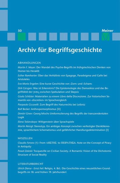 Inhalt Abhandlungen Martin F. Meyer Der Wandel des Psyche-Begriffs im frühgriechischen Denken von Homer bis Heraklit Esther Ramharter Über das Verhältnis von Epagoge, Paradeigma und Galle bei Aristoteles Eva-Maria Engelen Eine kurze Geschichte von 'Zorn' und 'Scham' Dirk Cürsgen Was ist Erkenntnis? Die Epistemologie des Damaskios und das Begriffsfeld der 'glosis' zwischen Spekulation und Skepsis Gisela Schlüter Materialien zu einem Libro della discrezione. Zur historischen Semantik von 'discrétion' im Sprachvergleich Pierpaolo Ciccarelli Zum Begriff des Naturrechts bei Leibniz Ralf Becker Anthropomorphismus [II] Dimitri Ginev Georg Mischs Umformulierung des Begriffs der transzendentalen Logik Elena Tatievskaya Wittgenstein über Sprachspiele Martin Reisigl Stereotyp. Ein ambiges Konzept zwischen verfestigter Denkökonomie, sprachlichem Schematismus und gefährlicher Handlungsdetermination [I]. Miszellen Claudio Ferone (+) From 'lestes' to 'peirates'. A Note on the Concept of Piracy in Antiquity Pawel Zaleski Tocqueville on Civilian Society. A Romantic Vision of the Dichotomic Structure of Social Reality Literaturbericht Ulrich Dierse Ernst Feil: Religio, Bd. 4 (Göttingen 2007) Abstracts Bibliographie Begriffsregister Adressenverzeichnis