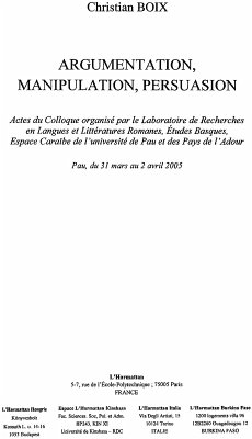 Cet ouvrage sur l'argumentation, la manipulation et la persuasion, s'interroge sur les categories qui fondent le phenomene argumentatif, etablit un lien entre la thematique argumentative et sa dimension de pratique sociale dans les domaines politiques, publicitaire, journalistique ou televisuel, s'interesse aux logiques linguistique, pragmatique ou enonciative qui gouvernent l'emploi de l'argumentation dans le cadre d'une strategie de discours.