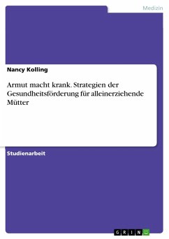 Studienarbeit aus dem Jahr 2015 im Fachbereich Gesundheit - Sonstiges, Note: 1,3, Hochschule Magdeburg-Stendal; Standort Magdeburg, Sprache: Deutsch, Abstract: In der vorliegenden Arbeit wird der Zusammenhang von Armut und Gesundheit an Hand der Zielgruppe alleinerziehender Mütter betrachtet. Auf der Basis epidemiologischer Daten wird die These "Armut macht krank" begründet und Ansätze zur Lösung des Problems entwickelt. Alleinerziehende Mütter sind explizit gesundheitlichen Belastungen ausgesetzt. Die Erziehung der Kinder, das Sorgen für den Lebensunterhalt und auch das Führen des Haushaltes stellt sie vor großen Herausforderungen. Vor dem Hintergrund, dass der Anteil der Frauen unter den Alleinerziehenden mit 88% besonders charakteristisch ist, befasst sich diese Arbeit hauptsächlich mit alleinerziehenden Müttern. Bei dieser Zielgruppe handelt es sich um Frauen ohne Partner oder Ehemann, die mit mindestens einem oder mehreren Kindern unter 18 Jahren in einem Haushalt zusammenleben. Um den Beweis der sozialen Ungleichheit im Gesundheitskontext zu erbringen, werden sie hier mit der Gruppe der verheirateten Mütter oder Müttern in Paarfamilien verglichen.
