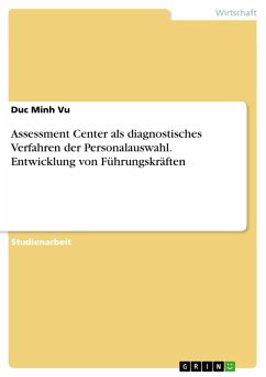 Studienarbeit aus dem Jahr 2018 im Fachbereich Führung und Personal - Recruiting, Note: 1,7, Fachhochschule des Mittelstands, Sprache: Deutsch, Abstract: Diese Arbeit soll den Leser vertrauter mit der Diagnostikmethode "Assessment Center" machen und auch Einblicke geben, wie solche eignungsdiagnostischen Verfahren in der Praxis letztendlich umgesetzt werden. Der Autor hat die Erfahrung gemacht, dass die Dienstleistung am häufigsten für die Besetzung von Teamleitern, also einer Führungskraft mit einer Personalverantwortung von drei bis fünf Personen, gekauft wird. Daher wird sich diese Arbeit auf diese Gruppe eingrenzen. Die essenziell relevante Hypothese "Assessment Center senken die Anzahl an Fehlbesetzungen und Development Center helfen Führungskräften Entwicklungsfelder genauer zu ermitteln" soll im Rahmen dieser Arbeit verifiziert beziehungsweise falsifiziert werden. Zunächst werden die Anwendungsgebiete im Personalmanagement "Personalauswahl" wie auch "Personalentwicklung" detaillierter behandelt. Außerdem wird die Begrifflichkeit "Berufliche Eignungsdiagnostik" genau definiert und mit der Beschreibung des Aufbaus und der Struktur für den Leser greifbarer gemacht. Anschließend werden Tests behandelt, die üblicherweise vor dem Center eingesetzt werden sowie Übungen, die im Center durchgeführt werden. Im weiteren Verlauf geht es um die Beobachter im Assessment Center, um die Anforderungen an die Beobachter und das Beobachtersystem an sich. Im Anschluss werden die Chancen und Risiken von Assessment- und Development Centern als Methode nochmal ausführlich dargelegt. Zum Schluss wird in einem kurzen Fazit alles zusammenfassend reflektiert. Ein beliebtes Verfahren der Eignungsdiagnostik, die von vielen Unternehmen eingesetzt wird, ist das Assessment Center zur Personalauswahl sowie das Development Center zur Personalentwicklung. Die Wurzeln des deutschen Assessment Centers liegen in den 1920er Jahren. Damals war das sogenannte Rundgespräch ein Teil des Auswahlverfahrens von Offizieren. Die Anwärter wurden in Gruppen von Psychologen begutachtet. Während der Interaktion versuchten diese, anhand der Beobachtung relevante Eigenschaften zu erkennen und Schlüsse zur Eignung herauszuziehen. Dieses Verfahren ist sozusagen der Vorgänger der heute sehr beliebten Übung "Gruppendiskussion", welche neben analytischen Aufgaben und Gesprächssimulationen zu den gängigsten Assessment- und Development Center Bestandteilen gehört.
