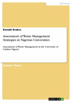 Bachelor Thesis from the year 2015 in the subject Business economics - Controlling, grade: 2'1, , course: Geography & Regional Planning, language: English, abstract: This study was undertaken to assess the management strategies of solid waste in the University of Calabar. In order to guide the study, 6 objectives were identified and one hypothesis formulated. Several literatures were reviewed and data was collected through structured questionnaires. Collected data was analyzed using the Pearson product moment correlation and the student t-test. Findings revealed that there is efficient waste management in the University of Calabar. Meaningful recommendations were suggested to create awareness of the need for a clean environment for man's habitation.