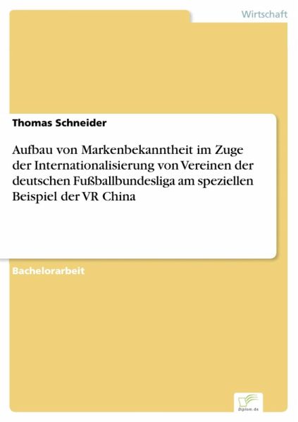 Die Internationalisierung ist ein Phänomen, welches nicht nur bei den klassischen Wirtschaftsunternehmen vielbeachtet wird. In jüngerer Vergangenheit fällt der Begriff der Internationalisierung auch immer wieder im Zusammenhang mit professionellen Fußballvereinen. Die Vereine der deutschen Fußballbundesliga richten ihren Fokus aus diversen Gründen zunehmend auf ausländische Märkte. Wie die Verantwortlichen der Vereine zumeist verkünden und im Verlauf der vorliegenden Arbeit deutlich wird, ist dabei insbesondere der chinesische Markt von großer Bedeutung. Ziel der Arbeit ist die Darlegung der Faktoren, durch die die Vereine der deutschen Fußballbundesliga ihre Markenbekanntheit in der Volksrepublik (VR) China erhöhen können, um damit die Basis für eine erfolgreiche Internationalisierung und ökonomischen Erfolg auf dem dortigen Markt zu schaffen.
