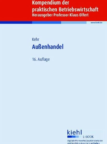 Die in der Print- und Online-Version dieses Titels ggf. enthaltenen Zusatzmaterialien und digitalen Mehrwerte stehen Ihnen aus technischen Gründen nicht zur Verfügung, wenn Sie das PDF-E-Book kaufen. Praxisorientiert und bewährt - die umfassende Einführung in die Grundlagen des Außenhandels. Von den Erscheinungsformen des Außenhandels über Transportwesen, Finanzierung, Recht und Durchführung bis hin zu den Außenhandelsrisiken stellt dieses bewährte Lehrbuch alle wichtigen Teilgebiete des internationalen Handels dar. Klar strukturiert und mit zahlreichen Beispielen ermöglicht es einen schnellen Zugriff auf alle benötigten Informationen. Umfangreiche Kontrollfragen und ein Übungsteil inklusive Lösungen helfen, das Gelesene zu vertiefen und den Wissensstand gezielt zu kontrollieren. Dieser Band eignet sich sowohl als begleitendes Lehrbuch für das Studium als auch als Nachschlagewerk für Praktiker. Inhaltsverzeichnis: Einführung (begriffliche Grundlagen, Bedeutung des Außenhandels, Welthandel und Handelspolitik, Außenhandel und europäischer Binnenmarkt, Institutionen für den Außenhandel). Erscheinungsformen des Außenhandels. Rechtliche Rahmenbedingungen im Außenhandel. Transportwesen im Außenhandel. Außenhandelskalkulation. Außenhandelsmarketing. Außenhandelsrisiken. Finanzdisposition im Außenhandel. Kurzfristige Außenhandelsfinanzierung. Mittel- und langfristige Außenhandelsfinanzierung. Übungsteil.