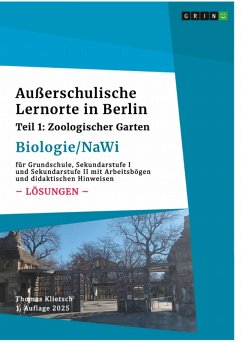 Fachbuch aus dem Jahr 2025 im Fachbereich Didaktik - Biologie, , Sprache: Deutsch, Abstract: Das Lösungsbuch zu dem 1. Teil der Buchreihe "Außerschulische Lernorte in Berlin (Biologie/Nawi)" mit detaillierten Lösungsvorschlägen zu allen Aufgaben. Es vereinfacht die Vorbereitung und spart viel Zeit für die Vorbereitung einer Exkursion in den Zoologischen Garten Berlin. Das Buch richtet sich speziell an Lehrer aller Schulstufen. Der 1. Teil der Buchreihe "Außerschulische Lernorte in Berlin (Biologie/Nawi)" beinhaltet Unterrichtseinheiten und vorgefertigte Arbeitsblätter für Lehrer aus der Grundschule, Sek I und Sek II für die Arbeit im Zoologischen Garten. Es wird ein kurzer theoretischer Einstieg zum Thema gegeben und dann differenziert nach Schulstufen die Unterrichtseinheit mit dazugehörigen Arbeitsblättern angeboten. Der Autor ist Studiendirektor für Naturwissenschaft im Ruhestand. Er unterrichtete Biologie und Mathematik an der Berliner Schule und hat in diesem Zusammenhang viele Exkursionen mit Schülern an Außerschulischen Lernorten geplant und durchgeführt. Von 1998 bis 2006 unterrichtete er an der Deutschen Schule in Guatemala, in den Jahren von 2016 bis 2024 in Mexiko (Puebla).