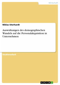 Studienarbeit aus dem Jahr 2023 im Fachbereich BWL - Allgemeines, Note: 1,3, FOM Hochschule für Oekonomie und Management gemeinnützige GmbH, Hochschulstudienzentrum Hamburg, Veranstaltung: Wissenschaftliches Arbeiten, Sprache: Deutsch, Abstract: In dieser Seminararbeit werden die Auswirkungen des demographischen Wandels auf die Personalakquisition in Unternehmen untersucht. Der demographische Wandel sorgt für Veränderungen und Herausforderungen in allen Lebensbereichen und entwickelt sich im Laufe der Zeit zu einer immer größer werdenden Herausforderung. Der demographische Wandel lässt sich in drei entscheidende Komponenten aufteilen: die Geburtenrate, die Lebenserwartung und die Migration. Diese drei Hauptkomponenten des demographischen Wandels sorgen für Veränderungen in der Gesellschaft und in der Wirtschaft. Die sinkende Geburtenrate sorgt dafür, dass weniger Menschen geboren werden, als in den letzten Jahren. Das sorgt wiederum dafür, dass es im Laufe der Zeit weniger Menschen im erwerbsfähigen Alter gibt. Zudem steigt durch eine immer besser werdende Medizin die Lebenserwartung stetig an, wodurch die Erwerbstätigen ein höheres Durchschnittsalter erreichen. Die angesprochenen Veränderungen und Herausforderungen werden beispielsweise im gesellschaftlichen Kontext im Zuge der gesetzlichen Rentenversicherung gefunden. Aber auch auf dem Arbeitsmarkt müssen Unternehmen lernen, mit dem demographischen Wandel zurechtzukommen. Die oben genannten Auswirkungen sorgen dafür, dass sich die Verfügbarkeit von Arbeitskräften verringert und sich deren Alter erhöht. Dies führt zu zwei Problematiken: durch eine niedrigere Zahl an Erwerbstätigen entsteht ein quantitatives Problem entsteht, jedoch sinkt auch die Produktivität eines Unternehmens durch älter werdende Mitarbeiter, was eine qualitative Problematik darstellt. Organisationen sehen sich also der Problematik entgegen, dass es immer schwieriger wird, externe Bewerber für unbesetzte Stellen zu finden und gleichzeitig mit der älter werdende Belegschaft produktiv wirtschaften zu können.