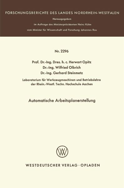 1. Einleitung.- 1.1 Situation der Arbeitsplanerstellung im Unternehmen.- 1.2 Zielsetzung der Forschungsarbeit.- 2. Voraussetzungen zur automatischen Arbeitsplanerstellung.- 2.1 Datenerfassung.- 2.2 Materialauswahl.- 2.3 Ermittlung des Arbeitsablaufes.- 2.4 Fertigungsmittelzuordnung.- 2.5 Zeitermittlung.- 2.6 Definition der Ausgabeinformationen (Arbeitsplandaten).- 3. Automatische Arbeitsplanerstellung für Varianten auf der Basis der Ähnlichkeitsplanung.- 3.1 Charakterisierung des Prinzips.- 3.2 Anwendbarkeit des Prinzips.- 3.3 Aufbau und Ablauf des Systems.- 3.4 Voraussetzung und Durchführung.- 4. Automatische Arbeitsplanerstellung auf der Basis der Neuplanung.- 4.1 Charakterisierung des Prinzips.- 4.2 Methoden der Optimierung.- 4.3 Anwendbarkeit des Prinzips.- 4.4 Arbeitsplanerstellung.- 5. Ausbaustufen der Arbeitsplanerstellung.- 5.1 Grundsätzliche Ausbaumöglichkeiten.- 5.2 Rohmaterialoptimierung.- 6. Arbeitsplanerstellung als Baustein eines integrierten Arbeitsplanungssystems.- 6.1 Arbeitsplanerstellung als Grundlage einer systematischen Arbeitsvorbereitung.- 7. Zusammenfassung.- 8. Schrifttum.