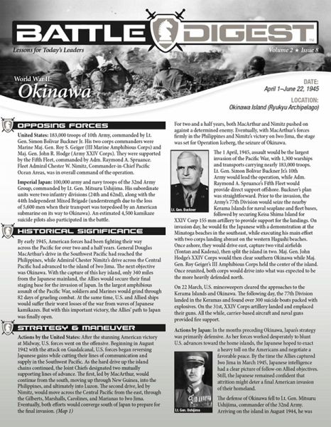The Battle Digest summary includes all the key aspects of the campaign and battle, including maps, images, and lessons learned. By early 1945, American forces had been fighting their way across the Pacific for over two and a half years. General Douglas MacArthur's drive in the Southwest Pacific had reached the Philippines, while Admiral Chester Nimitz's drive across the Central Pacific had advanced to the island of Iwo Jima. The next objective was Okinawa. With the capture of this key island, only 340 miles from the Japanese mainland, the Allies would secure their final staging base for the invasion of Japan. In the largest amphibious assault of the Pacific War, soldiers and Marines would grind through 82 days of combat. At the same time, U.S. and Allied ships would suffer their worst losses of the war from waves of Japanese kamikazes. But with this important victory, the Allies' path to Japan was finally open.