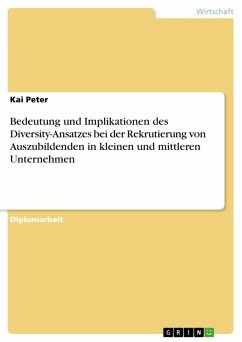 Diplomarbeit aus dem Jahr 2009 im Fachbereich Führung und Personal - Recruiting, Note: 2,0, Universität des Saarlandes, Sprache: Deutsch, Abstract: Gang der Untersuchung Grundlage der Arbeit ist die Analyse von Literatur sowie die Internetrecherche aus den Hauptthemengebieten Diversity, Personalmanagement und Ausbildung. Nachdem das Problem bekannt ist, werden die grundlegenden Begriffe für die Arbeit wie Diversity-Ansatz, Auszubildende, Rekrutierung und KMU bestimmt bzw. definiert. Weiter ist es für ein KMU wichtig, bevor es einen neuen Managementansatz einführt oder berücksichtigt, zu wissen, welchen Nutzen es davon haben könnte. Unter der Annahme, dass ein Nutzen für das KMU vor-liegt, ist zu klären, wie der Rekrutierungsprozess bei der Auswahl von Auszubildenden aussehen könnte. Dem Nutzen, der durch die Einführung des Diversity Ansatzes der KMU entsteht, steht auch Aufwand gegenüber. Der Abschnitt vor der Schlussbetrachtung zeigt daher auf, von welcher Art die Aufwendungen für die Einführung des Diversity Ansatzes sein könnten.