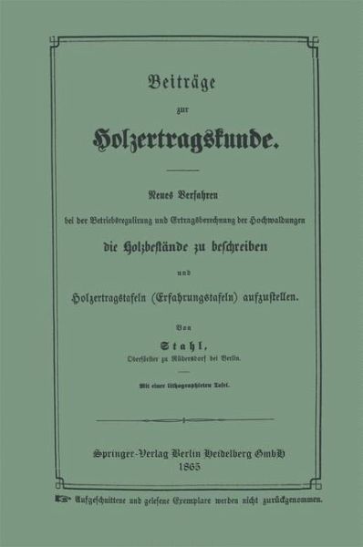 Neues Verfahren bei der Betriebsregulirung und Ertragsberechnung der Hochwaldungen die Holzbestände zu beschreiben und Holzertragstafeln (Erfahrungstafeln) aufzustellen. Berechnung des Geldwerthes des mittelmäßigen Kiefernbodens im Forstrevier Rüdersdorf bei verschiedenen Umtriebszeiten. kluppe und Metzbrett (Baumhöhenmesser) deren Anfertigung und gebrauch