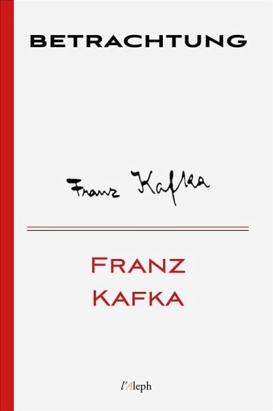Betrachtung ist ein Sammelband mit 18 meist kurzen Prosatexten von Franz Kafka, der Ende 1912 erschienen ist. Es war Kafkas erstes veröffentlichtes Buch und wurde - mit der Jahreszahl 1913 - im damals jungen Rowohlt-Verlag verlegt. Der kleine Sammelband trägt die Widmung Kafkas „Für M. B.", also für den Freund Max Brod. Franz Kafka (1883-1924) war ein deutschsprachiger Schriftsteller. Sein Hauptwerk bilden neben drei Romanfragmenten - Der Process, Das Schloss und Der Verschollene - zahlreiche Erzählungen. Kafkas Werke wurden zum größeren Teil erst nach seinem Tod und gegen seine letztwillige Verfügung von Max Brod veröffentlicht, einem engen Freund und Vertrauten, den Kafka als Nachlassverwalter bestimmt hatte. Kafkas Werke werden zum Kanon der Weltliteratur gezählt. Für die Beschreibung seiner ungewöhnlichen Art der Schilderung hat sich ein eigenes Wort entwickelt: „kafkaesk". Diese neue überarbeitete Ausgabe, erschienen bei l'Aleph, beinhaltet erstmals das literarische Gesamtwerk Kafka's in einem Band in elektronischer Form als Qualitäts E-book, ausgestattet mit einem eingebetteten detaillierten logischen Inhaltsverzeichnis , sowie entsprechenden Suchfunktionen und Hyper-Verlinkungen wichtiger Fragmente. Die Ganzheitlichkeit kombiniert mit den technischen Möglichkeiten, zeichnet diese Ausgabe für den Leser besonders aus.