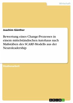 Studienarbeit aus dem Jahr 2017 im Fachbereich BWL - Unternehmensführung, Management, Organisation, Note: 1,0, FOM Essen, Hochschule für Oekonomie & Management gemeinnützige GmbH, Hochschulleitung Essen früher Fachhochschule, Sprache: Deutsch, Abstract: Diese Seminararbeit untersucht einen Change-Prozess in einem mittelständischen Autohaus. Der Change-Prozess wurde vom Management nicht unter ausdrücklicher Beachtung der Erkenntnisse der Neuroleadership durchgeführt. Die Arbeit soll untersuchen, inwiefern die Gestaltung dennoch mit den Vorgaben und Erkenntnissen des SCARF-Modells nach Rock, einem Modell aus der Neuroleadership, harmoniert. Nach der Vorstellung des Change-Prozesses wird hierzu ein entsprechender Fragebogen entwickelt, mit dem anschließend gemessen wird, wie die betreffenden Mitarbeiter des Unternehmens den Change-Prozess in Bezug auf die fünf Dimensionen des SCARF-Modells erlebten. Auf Grundlage dieser Erkenntnisse wird in der Folge diskutiert, ob und in welcher Weise der Change-Prozess unter Berücksichtigung des SCARF-Modells im vorliegenden Fall besser hätte gestaltet werden können.