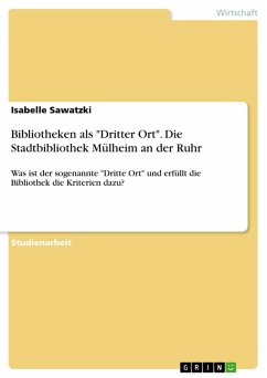 Studienarbeit aus dem Jahr 2018 im Fachbereich BWL - Informationswissenschaften, Informationsmanagement, Note: 1,7, Hochschule Hannover, Sprache: Deutsch, Abstract: Ziel dieser Hausarbeit ist die Klärung der Frage, ob und inwieweit die Stadtbibliothek Mülheim an der Ruhr als "Dritter Ort" bezeichnet werden kann oder welche Maßnahmen ergriffen werden müssten, um sie zu einem solchen zu machen. Zu Beginn werde ich mich mit der Definition von "Dritten Orten" im Allgemeinen beschäftigen. Im Folgenden steht die Problematik dieser Definition und ihrer Anwendung im Fokus. Im Anschluss betrachte ich, wie sich Bibliotheken in Australien den Besuchern präsentieren und wie sich ihre Denkweise im Laufe der Zeit verändert hat. Danach beleuchte ich die aktuelle Situation der Stadtbibliothek Mülheim an der Ruhr und stelle durch ein Interview mit der Bibliotheksleiterin fest, welche Pläne es für die Weiterentwicklung gibt. Schließlich werde ich alle Aspekte gemeinsam betrachten und ein Resümée ziehen. Für eine bessere Lesbarkeit wird das generische Maskulinum benutzt.