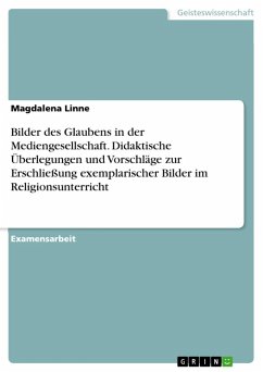 Examensarbeit aus dem Jahr 2002 im Fachbereich Theologie - Praktische Theologie, Note: 1, Johann Wolfgang Goethe-Universität Frankfurt am Main (Amt für Lehrerausbildung Frankfurt), Sprache: Deutsch, Abstract: Es gibt genügend Anlass, Bilder im Religionsunterricht zum Thema zu machen. Offenbar ist es für viele Lehrer zu einem verdrießlichen Geschäft geworden, Stunde für Stunde Texte zu interpretieren und deren Problemvorgaben zu diskutieren. Für SchülerInnen kann es attraktiver sein, wenn es etwas zu sehen gibt, besonders wenn es professionell von Fernseh- und Illustriertenleuten, von Fotoagenturen, Filmregisseuren und Werbeteams gemacht ist. Wir sind seit der Geburt rund um die Uhr von Bildern umgeben; wir träumen und denken sogar in Bildern. Das Medium Bild wird für die unterschiedlichsten Zwecke eingesetzt. Aber wie viele Bilder nehmen wir wirklich wahr? An vielen laufen wir vorbei, ohne sie aufzunehmen. Sie sind einfach da, überall. Aber welchen Einfluss haben sie auf uns? Wir wissen alle um die besondere Macht der Bilder. "Das letzte wird ein Bild sein, kein Wort. Vor den Bildern sterben die Wörter" , äußerte Christa Wolf in "Kassandra". Doch welche Bilder werden das sein? Und welchen Einfluss hat die Bilderflut der heutigen Massenmedien auf den Umgang der Jugendlichen mit Bildern des Glaubens? Die vorliegende Arbeit beschreibt Ansätze, die die Beantwortung der gestellten Fragen möglich machen sollen. Dabei wird an dieser Stelle ausdrücklich darauf hingewiesen, dass in der Behandlung des Themas fast ausschließlich nur gemalte Bilder der christlichen Kunst Berücksichtigung finden. Eine der Bedeutung von Photos gerechtwerdenden Betrachtung im vorliegenden Kontext würde den Rahmen dieser Arbeit sprengen und wird aus diesem Grund ausgelassen.