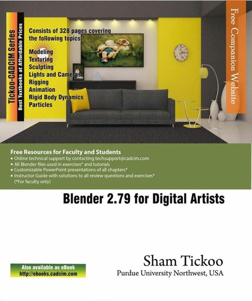 Consists of 11 chapters that are organized in a pedagogical sequence covering various aspects of modeling, sculpting, texturing, lighting, rigging, animation, rigid body dynamics, and particle system.