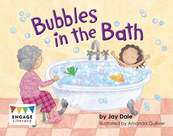 The girl is in the bathtub, and she can see the bubbles. Her toy duck, frog and fish can play in the bubbles.