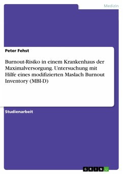 Studienarbeit aus dem Jahr 2015 im Fachbereich Pflegewissenschaft - Pflegemanagement, Note: 2,0, Hamburger Fern-Hochschule, Sprache: Deutsch, Abstract: In dieser Arbeit wird eine empirische Untersuchung zum Thema Burnout-Risiko bei Pflegepersonal in einem Krankenhaus durchgeführt. Zuerst wird die Ausgangssituation erläutert, indem ich erkläre was mich dazu gebraucht hat eine Untersuchung zu diesem Thema durchzuführen. Im weiteren Verlauf der Arbeit werde ich den Begriff "Burnout" mit Hilfe von Maslach definieren und thematisiere, welche Wirkungen und Folgen dieses Syndrom auf die Berufliche und private Lebenssituation haben kann. Nachfolgend stelle ich 2 Untersuchungsverfahren vor und erläutere theoretische Grundlagen zu den Untersuchungsverfahren Maslach-Burnout-Inventory und Tedium Measure. Im Anschluss erläutere ich das Forschungsdesign und stelle Fragestellungen und Hypothesen auf. Weiterhin beschreibe ich die Einzelschritte zum Vorgehen der Untersuchung und stelle die Ergebnisse grafisch dar. Zum Schluss Interpretiere und Diskutiere ich die Ergebnisse und zeige auf welche Präventionsmöglichkeiten angewendet werden könnten