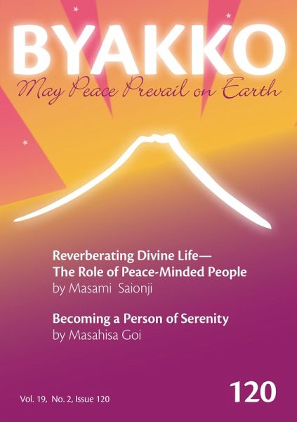 Issue 120 features two full articles by Masami Saionji -- "Reverberating Divine Life" and "Three Years of Large-Scale Transformation" -- as well as excerpts from two other articles. Also included is a talk given by Masahisa Goi in 1974, entitled "Becoming a Person of Serenity." The issue also features shorter articles by Yuka, Maki, and Rika Saionji, as well as a chapter from Masahisa Goi's novel "Anan."