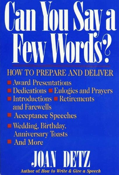 -Your alma mater asks you to say a few words at an upcoming fundraising dinner -You've won an employee award and will have to give a short acceptance speech at the ceremony -Your parents are celebrating their 50th anniversary, and you'd like to make a toast at their party Everyone's counting on you to sound polished, to be prepared, to speak with savvy-in short, to give a speech that's as memorable as the occasion itself. Don't dread these invitations to speak. Instead, learn to prepare clear, concise, and engaging speeches that will live up to your audience's expectations and match the mood of the occasion. Award-winning corporate speechwriter Joan Detz offers solid advice for tackling this nerve-racking task-with pointers, tips, and trade secrets that will help you make the most of every speaking opportunity. Clearly written and fun to read, this invaluable guide provides all the practical advice and encouragement you need to deliver a winning speech.