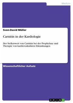 Wissenschaftlicher Aufsatz aus dem Jahr 2010 im Fachbereich Gesundheit - Ernährungswissenschaft, , Sprache: Deutsch, Abstract: Der bisherige Stellenwert einer gezielten L-Carnitinsubstitution in Deutschland ist in der Kardiologie und Ernährungstherapie noch untergeordnet. Ein Zusammenhang zwischen kardiovaskulären Erkrankungen und L-Carnitin ist in zahlreichen Studien belegt worden. Auch ein Zusammenhang zwischen Diabetes mellitus und Niereninsuffizienz ist aufgrund veränderter Stoffwechselparameter des L-Carnitins bei diesen Erkrankungen von Interesse und bedarf im Falle des Diabetes mellitus weiterer Forschung. Aufgrund seiner Rolle im Intermediärstoffwechsel der Fettsäuren ist eine Steigerung der Myokardaktivität durch Optimierung des Fettsäureangebots bei partiellem Sauerstoffmangel denkbar. Zusammenfassend stellt die Anwendung von L-Carnitin als Therapeutikum bei kardiovaskulären Erkrankungen einen interessanten Forschungsansatz dar. Vor dem Hintergrund der Relevanz, die Erkrankungen des Herzkreislaufsystems in den Industrienationen einnehmen, sollte diesem Forschungsfeld mehr Beachtung geschenkt werden.