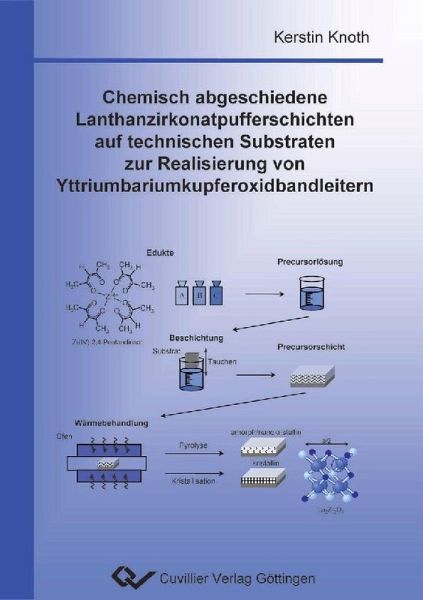 Die vorliegende Arbeit befasst sich mit der Herstellung von La2Zr2O7-Pufferschichten auf biaxial texturierten Ni-5at%W-Substraten durch chemische Abscheidung aus der Lösung. Diese Pufferschichten stellen einen wichtigen Baustein für die Realisierung von YBa2Cu3O7−x- Bandleitern dar, die für eine zukünftige Anwendung in der Energietechnik interessant sind. In Hinblick auf eine kostengünstige Herstellung der Bandleiter wird derzeit der chemischen Abscheidung aus der Lösung große Aufmerksamkeit gewidmet. Die Hauptkapitel dieser Arbeit befassen sich ausführlich mit der Entwicklung geeigneter Precursorlösungen zur Abscheidung der Pufferschichten und der Charakterisierung der Precursoren. Die Eigenschaften der La2Zr2O7-Pufferschichten, wie z. B. Textur, Morphologie, Eignung als Diffusionsbarriere gegen Ni-Diffusion werden ausführlich dargestellt und diskutiert. Für die Realisierung einer Bandleiterprobe wird die Beschichtung mit YBa2Cu3O7−x nach dem Trifluoracetatprozess in Verbindung mit der Abscheidung einer weiteren Pufferschicht, CeO2, untersucht. Von Interesse sind dabei die Wechselwirkungen zwischen den einzelnen Schichten sowie deren epitaktisches Wachstum aufeinander und die supraleitenden Eigenschaften des YBa2Cu3O7−x-Bandleiters. Als Vergleichssysteme dienen CeO2- und YBa2Cu3O7−x-Schichten, die mittels gepulster Laserdeposition abgeschieden wurden.