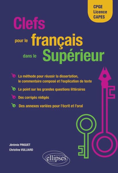 Le but de cet ouvrage est de donner aux étudiants qui arrivent dans le Supérieur diverses clefs pour le cours de français, que ce soit à l'Université (Licence et Master MEEF) ou en classes préparatoires littéraires (A/L, B/L, Chartes). Il s'agit de proposer les bases méthodologiques pour les trois exercices que sont la dissertation (ou composition) française, le commentaire composé et l'explication de texte linéaire, abordés par le biais de sujets avec des corrigés ou d'explications de texte rédigées. L'intérêt majeur de ce livre est qu'il peut accompagner les étudiants depuis leur première année jusqu'aux concours (ENS, Chartes, CAPES). Afin de présenter un parcours qui aide les étudiants à comprendre les attentes du Supérieur et qui mette à leur disposition différentes ressources, les auteurs ont souhaité proposer, outre les éléments de méthode, des plans de types variés sur les grandes questions littéraires, des exemples de commentaires rédigés, d'excellentes copies d'étudiants et de nombreuses annexes utiles aussi bien pour la rédaction que pour le commentaire ou la dissertation, puisqu'elles font le point, entre autres, sur des difficultés grammaticales et orthographiques récurrentes et fournissent de riches florilèges de citations.