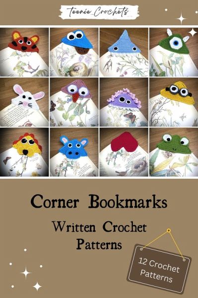 Who said that reading was boring?? these book marks put the fun back into books. Which is your favourite corner book mark? Now you can make all 12 and gift them to your favourite readers :) This crochet collection is perfect for the beginner crocheter. You will get the written crochet patterns for: Frog Heart Hippo Lion Minion Monster Monster Inc - Mike Owl Rabbit Shark Cookie Monster Tiger To make these you will need: 3.5mm crochet hook DK yarn in various colours Darning needle and scissor Skill level - easy - easy - intermediate. Pattern written using US terminology.