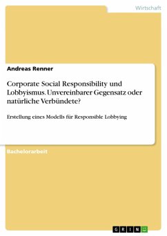 Bachelorarbeit aus dem Jahr 2019 im Fachbereich BWL - Unternehmensethik, Wirtschaftsethik, Note: 1,0, Munich Business School, Sprache: Deutsch, Abstract: Die Verbindung von Corporate Social Responsibility und Lobbying ist ein lange vernachlässigter Forschungsbereich, auch wenn beide für die Leistungsfähigkeit eines Unternehmens und seine Wettbewerbsfähigkeit entscheidend sein können. Während verantwortungsbewusste Unternehmen politisch und sozial gefördert und geehrt werden, wird Lobbyismus oft negativ und als demokratiegefährdend gesehen. Diese Arbeit trägt zur Synthese beider Themen bei. Zu diesem Zweck wurden vier Modelle für verantwortungsvolles Lobbying entwickelt, die auf Corporate Social Responsibility Modellen von Friedman, Carroll, Schwartz und Carroll basieren. In fünf semi-strukturierten explorativen Interviews wurden diese vier Modelle zusammen mit Bauers multidimensionalem Modell für verantwortungsvolles Lobbying bewertet. Die beruflichen Hintergründe der Befragten waren unterschiedlich, um eine Verengung der Perspektive zu minimieren. Unternehmen sollten verantwortungsbewusstes Lobbying betreiben, da sich Lobbyarbeit nachweislich positiv auf die Unternehmensleistung auswirkt und unternehmerische Verantwortung sowohl von Verbrauchern als auch von der Politik gewünscht wird. Letztere sollten dem Wunsch von Experten und Wählern nach mehr Transparenz in Form neuer Regeln entsprechen.