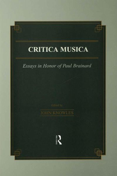 This is Volume 18 of eighteen in a book series on Musicology. Originally published in 1996, this is a collection of essays in honor or Paul Brainard. Critica Musica-thinking critically about music-is at the heart of Paul Brainard's long career, and of his legacy to his students, colleagues, and friends. As a scholar, performer, and teacher, Professor Brainard has embodied a thorough, meticulous, and reasoned approach to music and scholarship that has set a high standard for all who have come in contact with him.