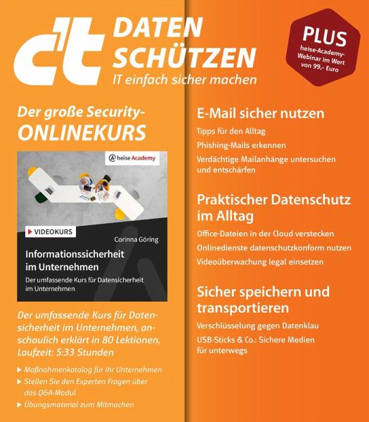 Im neuen Sonderheft "c't Daten schützen" zeigen wir Ihnen, welche Fehler Sie bei der Datensicherung vermeiden sollten, geben Ihnen handfeste Handlungsanweisungen, wie Sie Ihre Arbeit und den Datenschutz miteinander vereinen können und sich dabei gleichzeitig vor Angriffen von Cybergangstern schützen. Zusätzlich erhalten Sie einen heise-Academy-Videokurs "Informationssicherheit im Unternehmen" im Wert von 99 Euro.
