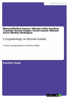 Scientific Study from the year 2007 in the subject Medicine - Anatomy, Physiology, Cytology, , course: 2007, language: English, abstract: A cross-sectional observational study was carried out on 152 patients with nodular thyroid lesions between January 2000 and December 2006, attended at the Endocrinology - Head and Neck Surgery clinic of the "Guillermo Domínguez López" General Teaching Hospital in Puerto Padre, who underwent fine needle aspiration biopsy (FNAB) where 22 cases were operated. 12 positives by cytology, 6 suspected and 4 by clinical and imaging data of malignancy, with the aim of specifying the clinical indications of this procedure, determining the age groups and sexes most affected by thyroid nodules, as well as the most frequent cytohistological variants in this environment and finally evaluating the degree of cytopathological and histopathological correlation of the operated cases. The studies conducted showed that the clinical indication was higher in the single thyroid nodule, with female sex and ages between 31 and 40 years prevailing. On the other hand, colloid goiter was the most frequent variety among benign lesions, while papillary carcinoma was the most representative among malignant lesions. The indication for FNA predominated in the single thyroid nodule, female sex and in the fourth decade of life, the most frequent benign nodular lesions of the thyroid was colloid goiter, while papillary carcinoma in malignant thyroid was also demonstrated a sensitivity of 100%, a specificity of 66.6% and an efficacy of 90.90%. with positive and negative predictive values of between 88.8 and 100%, respectively.