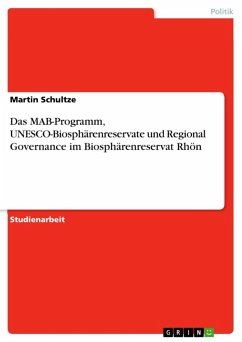 Studienarbeit aus dem Jahr 2009 im Fachbereich Politik - Klima- und Umweltpolitik, Note: 1,0, Philipps-Universität Marburg (Institut für Politikwissenschaft), Veranstaltung: Das UNESCO-Biosphärenreservat Rhön, Sprache: Deutsch, Abstract: In der Hausarbeit werden die Relevanz und Möglichkeiten der sozialwissenschaftlichen Governance-Forschung für Biosphärenreservate herausgestellt. Hierzu wird zunächst die Entwicklung des interdisziplinären MAB-Programmes und der Biosphärenreservate unter Berücksichtigung der humanen Dimension dieser Regionen vorgestellt (Kapitel 2). Anschließend werden Grundgedanken, Prämissen aber auch blinde Flecken des Governance-Ansatzes allgemein umrissen (Kapitel 3), ehe danach auf die für sozialwissenschaftliche Biosphärenreservatsforschung bedeutsame, spezifische Form des Regional Governance eingegangen wird. Insbesondere die Entstehung und Abgrenzung zu anderen Ansätzen, die Charakteristika, die Akteure und ihre Handlungslogiken bei Regional Governance werden vorgestellt (Kapitel 4). Abschließend wird untersucht, ob und wenn ja wie Regional Governance als Form der regionalen Selbststeuerung im Biosphärenreservat Rhön stattfindet und welche Potentiale und Grenzen dieser Steuerungsansatz für die nachhaltige Entwicklung solcher Regionen bietet (Kapitel 5+6).
