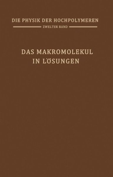 Erster Teil. Allgemeine Eigenschaften von Lösungen mit Makromolekülen.- Erstes Kapitel:Thermodynamische Betrachtungen.- Zweites Kapitel:Statistische Thermodynamik hochmolekularer Lösungen.- Drittes Kapitel:Löslichkeit und Quellung.- Viertes Kapitel: Kinetische und Transporterscheinungen.- Fünftes Kapitel: Viscosität.- Sechstes Kapitel: Lichtzerstreuung in Mischungen und Lösungen von Makromolekülen. Einfach- und Mehrfachstreuung.- Zweiter Teil. Besondere Methoden zur Bestimmung der Konstitution von Makromolekülen und Kolloidteilchen in Lösungen und Suspensionen.- Siebentes Kapitel:Osmotischer Druck.- Achtes Kapitel:Sedimentation und Diffusion von Makromolekülen.- Neuntes Kapitel:Lichtzerstreuung an Lösungen mit Kornmolekülen und Kolloidteilchen.- Zehntes Kapitel: Röntgenkleinwinkelstreuung von makromolekularen Lösungen.- Elftes Kapitel: Viscosität und Form.- Zwölftes Kapitel: Künstliche Doppelbrechung.- Dreizehntes Kapitel: Dielektrische Dispersion und Relaxation bei Lösungen mit Makromolekülen.- Vierzehntes Kapitel: Über die Form und innere Beweglichkeit von Fadenmolekülen in Lösung.- Fünfzehntes Kapitel:Polyelectrolytes.- Sechzehntes Kapitel:Größe und Form von Proteinmolekülen.- Siebzehntes Kapitel:Bestimmung der Molekulargewichtsverteilung durch Zerlegung in Fraktionen.- Namenverzeichnis.
