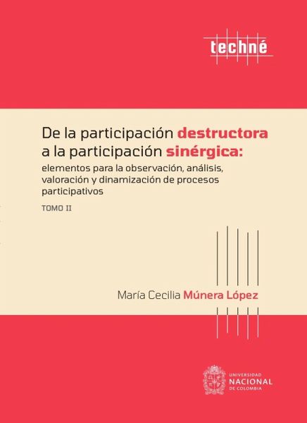 Esta obra recoge los últimos avances de la investigación "De la participación destructora a la participación sinérgica", iniciada durante la década de 1980 con el fin de lograr una mayor comprensión de la complejidad de los procesos de participación en la sociedad. En una primera fase, se identificaron tipologías de participación, desde la más negativa o destructora hasta la más positiva o sinérgica. Como marco de referencia se estableció una propuesta de resignificación del desarrollo entendido como "Construcción sociocultural múltiple, histórica y territorialmente contextualizada". Los resultados fueron publicados en el 2008, en un primer tomo que enfatiza en una nueva comprensión teórico conceptual de la participación social. En este segundo tomo se ofrecen mecanismos e instrumentos para la observación, procesamiento, análisis, interpretación y valoración cualitativa y cuantitativa del conjunto de variables identificadas en el tomo anterior y para la dinamización y seguimiento de los procesos participativos. Tantos los aportes teóricos como instrumentales se fundamentan en una aproximación epistemológica, que se distancia de las lógicas lineales, duales y mecanicistas propias de la modernidad y enfatiza en las de carácter sistémico, dialógico, recursivo, retroactivo y hologramático, entre otras. De esta manera, los procesos de participación, y las tipologías que los caracterizan, no se conciben como realidades estáticas y opuestas sino como dinámicas de poder, establecidas a partir de intercambios y flujos sociales múltiples propios de la transmodernidad.