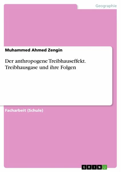 Facharbeit (Schule) aus dem Jahr 2014 im Fachbereich Geowissenschaften / Geographie - Geographie als Schulfach, Note: 1,5, , Sprache: Deutsch, Abstract: Der Anstieg der Durchschnittstemperatur der Erdatmosphäre und der Meere wird seit der Mitte des 19.Jahrhunderts beobachtet. Dabei spielen Treibhausgase eine sehr wichtige Rolle. Natürliche Treibhausgase sind dafür verantwortlich, dass die Erdmitteltemperatur konstant bleibt. Zu diesen natürlichen Treibhausgasen zählen unter anderem Kohlenstoffdioxid und Methan. Die Gase bewirken dass die Erde erwärmt wird und nicht eine niedrige Mitteltemperatur erreicht. Doch für den Anstieg der Durchschnittstemperatur der Erde sind auch die durch den Menschen verursachten Treibhausgase verantwortlich welche der Umwelt schaden. Dies nennt man den anthropogenen Treibhauseffekt. Anthropogen bedeutet so viel wie künstlich bzw. vom Menschen geschaffen. Dieser Treibhauseffekt wird also durch den Menschen verursacht und ist auch ein Grund für die Globale Erwärmung.