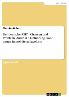 Diplomarbeit aus dem Jahr 2006 im Fachbereich BWL - Rechnungswesen, Bilanzierung, Steuern, Note: 1,6, Europa-Universität Viadrina Frankfurt (Oder), Sprache: Deutsch, Abstract: Das Thema der Immobilienanlage hat in den letzten Jahren verstärkt Aufmerksamkeit erfahren, nachdem es lange Zeit im Vergleich zu anderen Anlageformen, wie z. B. der Aktienanlage, eher wenig Beachtung fand. Der Innovationsgrad im Immobilieninvestmentbereich war im Gegensatz zu anderen Anlagemärkten bisher gering. International gilt der Real Estate Investment Trust (REIT) als die Innovation schlechthin. Diese Sichtweise scheint sich auch national anhand der Entwicklung der letzten Jahre zu bestätigen. So haben die Forderungen nach der Einführung dieser Anlageform in Deutschland mehr und mehr zugenommen. In dieser Arbeit wird der Frage nachgegangen, welche Chancen und Probleme sich aus der geplanten Schaffung eines deutschen REIT ergeben. Hierzu gliedert sich die Arbeit in vier Hauptteile: Zunächst wird auf die derzeit am deutschen Immobilienanlagemarkt bestehenden indirekten Investitionsformen sowie die aktuelle Marktsituation eingegangen. Anschließend werden das Prinzip eines REIT und die Vorteile dieser Anlageform vorgestellt sowie die REIT-Konstrukte ausgewählter Länder verglichen. Danach folgt eine Erläuterung der für die Ausgestaltung eines deutschen REIT vorgeschlagenen Modelle. Schließlich sollen Gestaltungsempfehlungen für Deutschland ausgesprochen und sowohl sich ergebende Probleme identifiziert, als auch mögliche Lösungsvorschläge vor dem Hintergrund bestehender Modelle und eigener Überlegungen eingebracht werden. Der Schwerpunkt soll hierbei neben einer gesellschafts- und kapitalmarktrechtlichen Betrachtung insbesondere auf steuerlichen Fragestellungen liegen. Hierbei wird außerdem auf Spezialprobleme eingegangen, die mit der Schaffung eines deutschen REIT zusammenhängen.