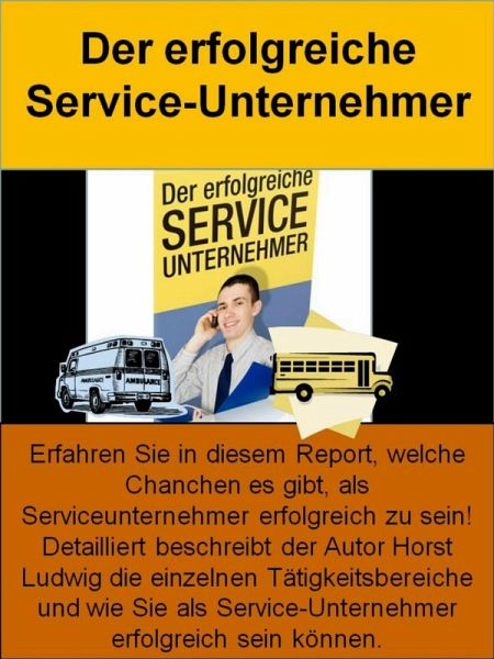 Erfahren Sie in diesem Report, welche Chancen es gibt, als Serviceunternehmer erfolgreich zu sein! Detailliert beschreibt der Autor Horst Ludwig die einzelnen Tätigkeitsbereiche und wie Sie als Service-Unternehmer erfolgreich sein können. Vorteile des privaten Serviceunternehmers PKW-Kurierdienst Fahrradkurier Taxifahrer Kleintransportunternehmer Güternahverkehr Güterfernverkehr Privater Paketdienst Auslieferungsservice Autovermietung Mitfahrer-Service Mitfahrer-Vermittlung Prospekt- und Werbeverteilung Postverteiler Packer-Sofortdienst Büro-Aushilfsdienst Tele-Schreibdienst Hotel-Schreibdienst Bürovermietung Firmendomizil Telefaxagentur Telefaxvertrieb Kontaktvermittlung für "einsame" Computer Computerwerbeagentur Containervermittlung Manager-Krisenberatung Fahrradhandel Fahrrad- und Mopedverleih Nachtservice Grabpflegeservice Grabsteinreinigung und Schrifterneuerung Porträtanfertigung von Verstorbenen