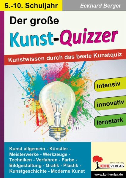 Wissens-, Kreativitäts- & Sozialkompetenzen nehmen durch Teilnahme an einem Quiz schnell zu. Kunstquizzer greift diese Entwicklung mit einem neuen Konzept auf und ist das erste Werk, das das komplette Wissen aus Kunst und Kunstgeschichte umfasst, gemäß den Standards in unterschiedlichen Schwierigkeitsgraden. Die Kopiervorlagen umfassen Kunst allgemein, Fachbegriffe, Künstler, Meisterwerke, Techniken und Verfahren, Werkzeuge, Farbe, Bildgestaltung, Malerei, Grafik, Plastik u.v.m. 84 Seiten (einzelne Farbseiten)