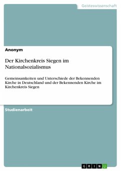 Studienarbeit aus dem Jahr 2022 im Fachbereich Theologie - Historische Theologie, Kirchengeschichte, Note: 1,0, Universität Siegen, Sprache: Deutsch, Abstract: Diese Hausarbeit untersucht die Gemeinsamkeiten und Unterschiede zwischen der deutschlandweiten Bekennenden Kirche und ihrer Ausprägung im Kirchenkreis Siegen während der Zeit des Nationalsozialismus. Im Fokus stehen zentrale Vergleichsaspekte wie der Rückhalt in der Bevölkerung, die Konflikte mit den Deutschen Christen, die konkreten Maßnahmen im Kirchenkampf sowie der Umgang mit Pfarrern im Widerstand. Besonderes Augenmerk gilt der reformierten Prägung und der konservativen Haltung des Siegerlandes, die zu einer regionalen Sonderstellung innerhalb der Bekennenden Kirche führten.