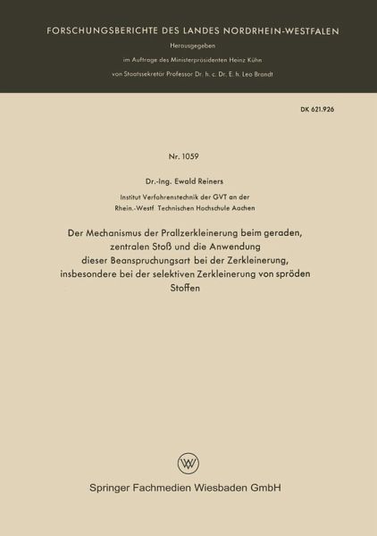 Gliederung.- 1. Einleitung.- 2. Begriffsbestimmungen und theoretische Betrachtungen.- 3. Aufgabenstellung.- 4. Versuchsaufbau und Versuchsdurchführung.- 5. Der zeitliche Ablauf des Prallzerkleinerungsvorganges.- 6. Einfluß der Aufprallgeschwindigkeit.- 7. Einfluß der Aufgabekorngröße auf die Zerkleinerung.- 8. Einfluß der Materialeigenschaften.- 9. Einfluß der Aufprallwand.- 10. Zusammenfassung.- 11. Anhang.