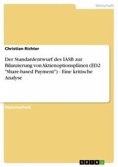 Diplomarbeit aus dem Jahr 2003 im Fachbereich BWL - Rechnungswesen, Bilanzierung, Steuern, Note: 2,0, Verwaltungs- und Wirtschafts-Akademie Bochum gGmbH (IUR Ruhr-Uni Bochum), Veranstaltung: Bilanzierung, Sprache: Deutsch, Abstract: Die Bilanzierung von Aktienoptionsplänen, die Mitarbeitern und Führungskräften zum Zweck der Entlohnung gewährt werden, wurde bislang nicht von den im Rahmen der IFRS (international financial reporting standards) verabschiedeten Rechnungslegungsnormen abgedeckt. Nicht zuletzt aus diesem Grund war dieses Thema Gegenstand intensiver Diskussionen zwischen den Experten der internationalen Rechnungslegung.1 Das IASB hat den Regelungsbedarf erkannt und veröffentlichte deshalb am 7. November 2002 seinen exposure draft 2 "share-based payment",2 den die interessierte Öffentlichkeit bis zum 7. März 2003 kommentieren konnte. Ziel der vorliegenden Arbeit ist es, den Diskussionsentwurf des IASB kritisch zu hinterfragen und eventuelle, inhaltliche Defizite ausfindig zu machen. Da ED 2 bislang nicht in einen endgültigen Standard überführt wurde, entfällt eine kritische Analyse anhand praktischer Erfahrungen und kann sich lediglich auf theoretische Überlegungen stützen, die von Fallbeispielen untermauert werden sollen. Die Arbeit versucht dabei nicht, Lösungsvorschläge möglicher Problemstellungen zu entwickeln, da zu diesem Zweck ebenso die Vorschläge anderer Standardsetter3 in die Betrachtung mit einfließen müssten. Bevor jedoch der Standardentwurf kritisch gewürdigt wird, sollen dem Leser im zweiten Kapitel die zum weiteren Verständnis der Ausführungen notwendigen Grundlagen der Aktienoptionspläne vermittelt werden. Einen Schwerpunkt der Arbeit bildet die differenzierte Darstellung der vom IASB im Rahmen von ED 2 veröffentlichten Vorschriften, die im dritten Kapitel vorgestellt werden. Ebenso bedeutsam ist das darauf folgende vierte Kapitel, in dem die zuvor beschriebenen Regelungen einer sachlichen Prüfung unterzogen werden. Das fünfte Kapitel fasst die Ergebnisse der vorangegangen Überlegungen kurz zusammen und gibt einen Ausblick auf mögliche Entwicklungen bezüglich der Konvergenzbestrebungen der Standardsetter. 1 Vgl. Pellens/Crasselt (a), 1998, S. 217ff. 2 Der Entwurf sowie eine implementation guidance und die basis for conclusions können unter www.iasc.org.uk heruntergeladen werden. 3 Wie bspw. DSR oder FASB.