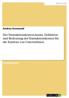 Studienarbeit aus dem Jahr 2005 im Fachbereich Führung und Personal - Sonstiges, Note: 1,0, Verwaltungs- und Wirtschafts-Akademie Bochum gGmbH, Sprache: Deutsch, Abstract: Das Anliegen dieser Arbeit ist es, dem Leser einen Einblick in die neoinstitutionale Transaktionkostentheorie zu verschaffen. Der Transaktionskosten-Ansatz umfasst ein weitreichendes Anwendungsgebiet. Er leistet z.B. bemerkenswerte Beiträge in der Untersuchung interner Organisationsgestaltung (Arbeitsteilung/Spezialisierung), betrachtet Strukturwandlungsprozesse und Problemstellungen der Wettbewerbssicherung und Fusionskontrolle, die hier jedoch nicht Gegenstand dieser Arbeit sein sollen. Schwerpunkt dieser Arbeit liegt auf der Darlegung des Transaktionskosten-Ansatzes als Theorie der Unternehmung. Dabei soll deutlich werden, dass es keine ökonomische Grundlage für die Existenz von Unternehmen unter Vernachlässigung der Transaktionskosten gibt. Im zweiten Kapitel werden dem Leser zunächst Grundzüge der Transaktionskostentheorie vorgestellt, die einen Überblick über den Gegenstand tranaktionskostentheoretischer Betrachtungen geben. Der hier erwähnte Transaktionskostenbegriff soll im dritten Kapitel dann näher definiert und klassifiziert werden. Darüber hinaus werden hier auch die wesentlichen Einflussgrößen von Transaktionskosten eingehend betrachtet. Im anschließenden vierten Kapitel soll dann die Bedeutung der Transaktionskosten für die Existenz von Unternehmen herausgearbeitet werden, sowie Organisationslösungen zur effizienten Gestaltung von Austauschbeziehungen vorgestellt werden. Im fünften Kapitel erfolgt dann eine kritische Würdigung des Transaktionskosten-Ansatzes, bevor die Arbeit im sechsten Kapitel mit einem Fazit abgeschlossen wird.