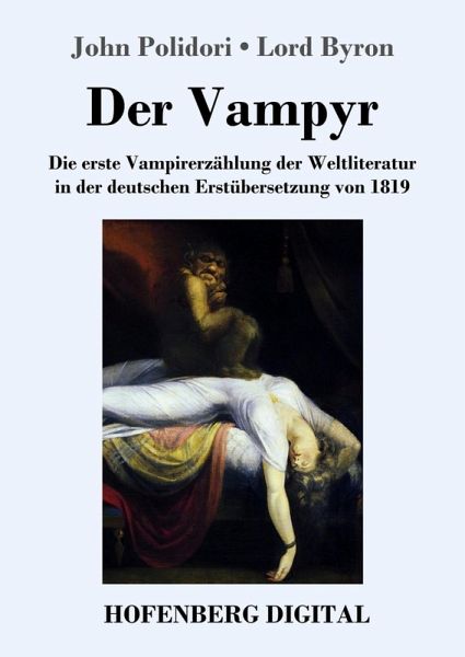 John Polidori, Lord Byron: Der Vampyr. Die erste Vampirerzählung der Weltliteratur in der deutschen Erstübersetzung von 1819 »Der Vampyr« wurde am 1. April 1819 vom Verlag Colburn in der Zeitschrift »New Monthly Magazine« ohne Polidoris Erlaubnis veröffentlicht. Die Geschichte wurde falsch untertitelt und als »A Tale by Lord Byron« (»Eine Geschichte von Lord Byron«) bezeichnet. Der Name der Hauptfigur Lord Ruthven führte zu dieser Verwechslung, weil dieser Name ursprünglich in Caroline Lambs Roman »Glenarvon« Verwendung fand, der vom selben Herausgeber veröffentlicht wurde, und darin auch eine Zeichnung von Lord Byron vorhanden war. Lambs Werke wurden damals anonym herausgebracht und so nahm der Coburn-Verlag an, »Der Vampyr« könne von Byron stammen. Die Textgrundlage der vorliegenden Ausgabe ist »Der Vampyr«, erschienen 1819 in deutscher Übersetzung bei Leopold Voß, Leipzig. Neuausgabe. Herausgegeben von Karl-Maria Guth. Berlin 2017. Umschlaggestaltung von Thomas Schultz-Overhage unter Verwendung des Bildes: Johann Heinrich Füssli, Nachtmahr, 1781. Gesetzt aus der Minion Pro, 12 pt.