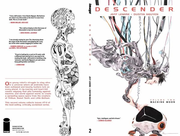 Young robot boy TIM-21 and his companions struggle to stay alive in a universe where all androids have been outlawed and bounty hunters lurk on every planet. DESCENDER is a rip-roaring and heart-felt cosmic odyssey, pitting humanity against machine and world against world to create a sprawling epic. Collects DESCENDER #7-11