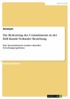Bachelorarbeit aus dem Jahr 2017 im Fachbereich BWL - Offline-Marketing und Online-Marketing, Note: 1.0, Ruhr-Universität Bochum, Sprache: Deutsch, Abstract: Die vorliegende Arbeit beschäftigt sich mit den drei Commitment-Beziehungen: Mitarbeiterbindung (Organisatorisches Commitment), Commitment im Relationship Marketing und das Interpersönliche Commitment. Diese drei bindenden Kräfte führen zu einem kooperativen Handeln, um eine langfristige Geschäftsbeziehung aufrecht zu erhalten. Das Organisatorische Commitment ist die Bindung zwischen dem Unternehmen mit den eigenen Mitarbeitern. Diese ist essenziell für den Erfolg eines Unternehmens, da der Verlust von gut qualifizierten Mitarbeitern ein Kostenfaktor ist. Das Commitment im Relationship Marketing ist die Bindung zwischen dem Unternehmen und dem Geschäftskunden, und hier bezeichnet das Interpersönliche Commitment spezieller die Bindung zwischen dem Vertriebler und dem Kunden. Ein Unternehmen möchte dafür sorgen, dass sowohl der eigene Vertriebler als auch der Kunde an das Unternehmen gebunden sind. Denn ein Verlust des Vertrieblers kann zu erheblichen Folgen führen, vor allem wenn der Kunde stärker an den Vertriebler gebunden ist als an das Unternehmen. Wechselt der Vertriebler das Unternehmen, können seine Kunden ihm folgen, und das Unternehmen verliert beide Beziehungen. Unternehmen müssen dafür sorgen, dass das Commitment hoch genug ist, sodass trotz Vertriebler-Wechsel der Kunde noch bleibt. Jedoch ist das interpersönliche Commitment zwischen Vertriebler und Kunde unersetzlich, da der Vertriebler besser auf die Bedürfnisse der Kunden eingehen und Probleme lösen kann. Es fehlt in der Forschung an Vorschlägen zu faktischen Vorkehrungen, wie solch interpersönliche Bindungen aufgebaut werden sollen und welche Rolle das Commitment in der Beziehung zwischen Vertriebler-Kunde spielt.