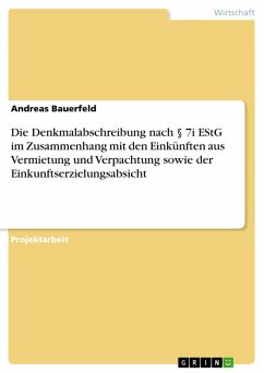 Projektarbeit aus dem Jahr 2015 im Fachbereich BWL - Rechnungswesen, Bilanzierung, Steuern, Note: 1,3, Hochschule Merseburg, Veranstaltung: Ertragssteuerrecht, Sprache: Deutsch, Abstract: In Zeiten sinkender Zins- und Dividendenerträge auf Spareinlagen, Aktien und Fonds, interessieren sich mehr und mehr Menschen für Alternativen um ihr Geld möglichst gewinnbringend und ertragreich anzulegen. Für viele bietet die Anlage des Geldes in Immobilien eine sichere Möglichkeit, da der Wohnungsmarkt je nach Region und Kommune weitestgehend sicher und stabil ist. Was jedoch viele bei der ersten Überlegung zunächst nicht bedenken, ist die Tatsache, dass die daraus erzielten Vermietungserträge steuerpflichtige Einkünfte im Sinne des deutschen Einkommensteuerrechts darstellen. Auch hier wird, meist im Zusammenspiel mit dem Steuerberater, nach einer Möglichkeit gesucht, das Geld einzunehmen, aber die Steuerlast darauf möglichst gering zu halten. An dieser Stelle kann die Überlegung sinnvoll sein, dass Geld in eine denkmalgeschützte Immobilie zu investieren, die sich unter Umständen sogar in einer zentralen Altstadtlage einer größeren Kommune befindet. Dadurch sind zwar zunächst höhere Kosten für Anschaffung und Renovierung nötig, gleichzeitig sind die erzielbaren Erträge wesentlich höher als bei einer Immobilie auf dem Lande. Dennoch ist auch bei solchen steuerlichen Überlegungen und Gestaltungen darauf zu achten, dass man sich stets im Rahmen der gesetzlichen Möglichkeiten bewegt um eventuell auftretende steuerliche Fallstricke zu vermeiden. Aus diesem Grunde wird sich nachfolgende Untersuchung mit der Steuerpflicht von Vermietungseinkünften beschäftigen und dabei auch auf die Möglichkeiten der Denkmalabschreibung hinweisen. Gleichzeitig wird auch auf eventuelle Fehlerquellen bei der Vermietung an Angehörige oder bei Vermietungen unter dem marktüblichen Mietzins eingegangen. Ein besonderes Augenmerk wird dabei auf die Möglichkeiten der steuerlichen Sonderabschreibung in Form der Denkmalabschreibung gelegt.