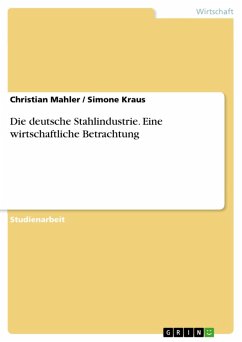 Studienarbeit aus dem Jahr 2004 im Fachbereich BWL - Industriebetriebslehre, Note: 1,7, Hochschule Mainz, Veranstaltung: Branchenkompass, Sprache: Deutsch, Abstract: Im Mittelpunkt der Branchenanalyse steht die wirtschaftliche Betrachtung der Stahlindustrie. Der Schwerpunkt liegt auf den nationalen Faktoren. Es werden die verschiedenen Rahmenbedingung betrachtet, die Auswirkungen auf die aktuelle und zukünftige Entwicklung der Branche haben. Ziel ist es, die Stabilität der Stahlindustrie, ihre Stellung und Bedeutung im Konjunkturzyklus und die technologischen und strukturellen Veränderungen darzustellen.