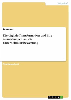 Studienarbeit aus dem Jahr 2019 im Fachbereich BWL - Sonstiges, Note: 2,0, FOM Hochschule für Oekonomie & Management gemeinnützige GmbH, Frankfurt früher Fachhochschule, Sprache: Deutsch, Abstract: Das Ziel der vorliegenden Arbeit besteht darin, die Zusammenhänge zwischen der Digitalisierung und der Unternehmensbewertung in den Grundzügen aufzuzeigen. Unternehmen und die Art ihrer Wertschöpfung unterliegen einem stetigen Wandel. Die Möglichkeiten neuer Technologien und die Strategien zur Digitalisierung haben unter anderem zahlreiche Auswirkungen auf die Unternehmensbewertung. Durch die Digitalisierung verändern sich zum einen Geschäftsmodelle, Branchenstrukturen, sowie interne Prozesse und Arbeitsweisen teilweise erheblich. Zum anderen erzeugt die digitale Transformation einen hohen Veränderungsdruck in Unternehmen. Die Geschwindigkeit und der Grad der Vernetzung steigen, insbesondere durch disruptive Technologien, exponentiell an. Zugleich stellt sich die Frage, was dies für den Bewerter und den Bewertungsprozess bedeutet. Regelmäßig wird es zu einer Verschiebung der reinen Herstellung eines Produktes oder der Erbringung einer Dienstleistung hin zu einem Service rund um die Nutzung eines Produktes und einer Dienstleistung kommen. Hierdurch wird die Wertschöpfungskette im Unternehmen wesentlich größer und länger. Zudem dringen in diese Wertschöpfungsbereiche neue, auch branchenfremde,Wettbewerber ein und bedrohen die Geschäftsmodelle der existierenden Unternehmen. Die Unsicherheit in den Unternehmen und insbesondere die Planungs- und Prognoseunsicherheit nimmt somit zu. Die Nachhaltigkeit der operativen und bestehenden Geschäftsmodelle wird durch diese Veränderung stark in Frage gestellt.