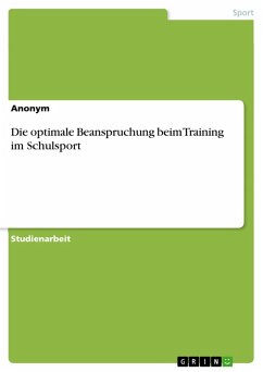 Studienarbeit aus dem Jahr 2008 im Fachbereich Sport - Bewegungs- und Trainingslehre, Note: 12 Punkte, Justus-Liebig-Universität Gießen, Sprache: Deutsch, Abstract: In dieser Arbeit möchte ich näher auf die Frage eingehen, ob Training in der Schule sinnvoll und durchführbar ist und welchen Beitrag die Trainingswissenschaft für den Schulsport leisten kann, damit eine möglichst optimale Beanspruchung der Schüler/innen erreicht wird. Im Anschluss daran möchte ich noch einige praktische Möglichkeiten zur Steuerung und Differenzierung im Schulsport aufzeigen und kurz eine Möglichkeit zur Messung der Beanspruchung nennen. Schulsport hat die Aufgabe verschiedenste Erfahrungen den Schüler/innen zu vermitteln. Zum Einen sollen sie vielseitige Bewegungs- und Körpererfahrungen machen, zum anderen soll auch soziales Lernen im Sportunterricht stattfinden. Sportunterricht wird des Weiteren durch den Aspekt der Gesundheitsförderung legitimiert, denn der Gesundheitszustand unserer Jugend ist erschreckend schlecht: "Jeder vierte weist Kreislaufschwächen, jeder zweite Haltungsschäden auf, jeder dritte ist übergewichtig, und jeder zweite schafft nicht einmal einen Klimmzug." Gerade der Gesundheitsaspekt ist ein Argument warum Trainings im Schulsport stattfinden sollte.