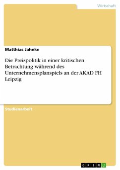 Studienarbeit aus dem Jahr 2011 im Fachbereich BWL - Sonstiges, Note: 1,0, AKAD-Fachhochschule Leipzig, Veranstaltung: Unternehmensplanspiel, Sprache: Deutsch, Abstract: "Es stimmt nicht, daß die Kosten die Preise bestimmen. Die im Markt erzielbaren Preise definieren die Kosten, die man sich leisten kann" . Dieses Zitat von Rainer Megerle zeigt sehr deutlich, wie wichtig die genaue Abstimmung der Preispolitik in einer globalisierten Wirtschaftswelt ist. Dabei spielen äußere Einflüsse eine immer kritischere und bedeutsamere Rolle.