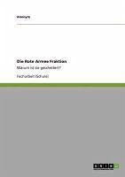 Facharbeit (Schule) aus dem Jahr 2010 im Fachbereich Gemeinschaftskunde / Sozialkunde, einseitig bedruckt, Note: 2, - (Hochrheingymnasium Waldshut), Sprache: Deutsch, Abstract: Kaum einer kennt sie nicht, die "Rote Armee Fraktion" oder "RAF", wie sie oft abge-kürzt wird. Auch wenn sie seit einigen Jahren nicht mehr existiert, erreichen uns in den Nachrichten noch immer Meldungen über ehemalige inhaftierte RAF-Mitglieder. Als ich erstmals auf die RAF aufmerksam wurde, wollte ich gleich mehr über sie er-fahren. Mit dieser Seminararbeit bot sich mir eine hervorragende Möglichkeit, mich mit diesem Thema auseinanderzusetzen. Ich wollte in Erfahrung bringen, wer diese Menschen waren und wie sie es schaffen konnten, die Bundesrepublik Jahre lang zu terrorisieren. Ich habe es mir deshalb unter anderem zur Aufgabe gemacht, in dieser Seminararbeit grundlegende Fragen, die im Zusammenhang mit der RAF aufkommen zu beantworten. Dazu werde ich vor allem die Rote Armee Fraktion im Sinne einer terroristischen Untergrundorganisation untersuchen. Weiterhin möchte ich einen Versuch wagen, Ihnen einen Einblick in die moralischen Werte der RAF zu gewähren und schließlich die Frage beantworten, warum die RAF scheiterte.Da ich Wert darauf gelegt habe, eine schlüssige und zusammenhängende Arbeit zu schreiben, sollte es Ihnen keine Probleme bereiten, diese Arbeit auch ohne besondere Vorkenntnisse zu verstehen. Deshalb richtet sich diese Seminararbeit auch nicht an einen bestimmten Personenkreis, sondern an all diejenigen, die ein bisschen mehr über den langjährigen Staatsfeind Nummer eins erfahren möchten. Die einzelnen Artikel bauen chronologisch aufeinander auf, so dass es zwar von Vorteil aber nicht zwingend notwendig ist, sie der Reihe nach zu lesen.Ich hoffe, dass Sie durch diese Seminararbeit ein paar neue Erkenntnisse gewinnen können und wünsche Ihnen dabei viel Erfolg.